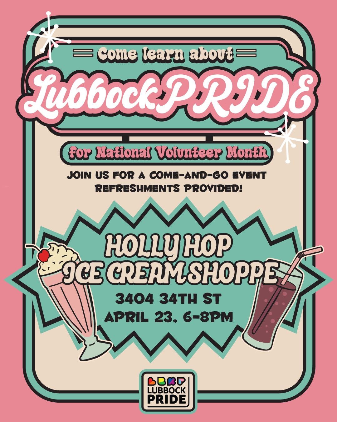 Come learn about Lubbock Pride for National Volunteer Month! From 6-8pm on April 23rd, we will gather in the party room at Holly Hop Ice Cream Shoppe for some information & introductions.